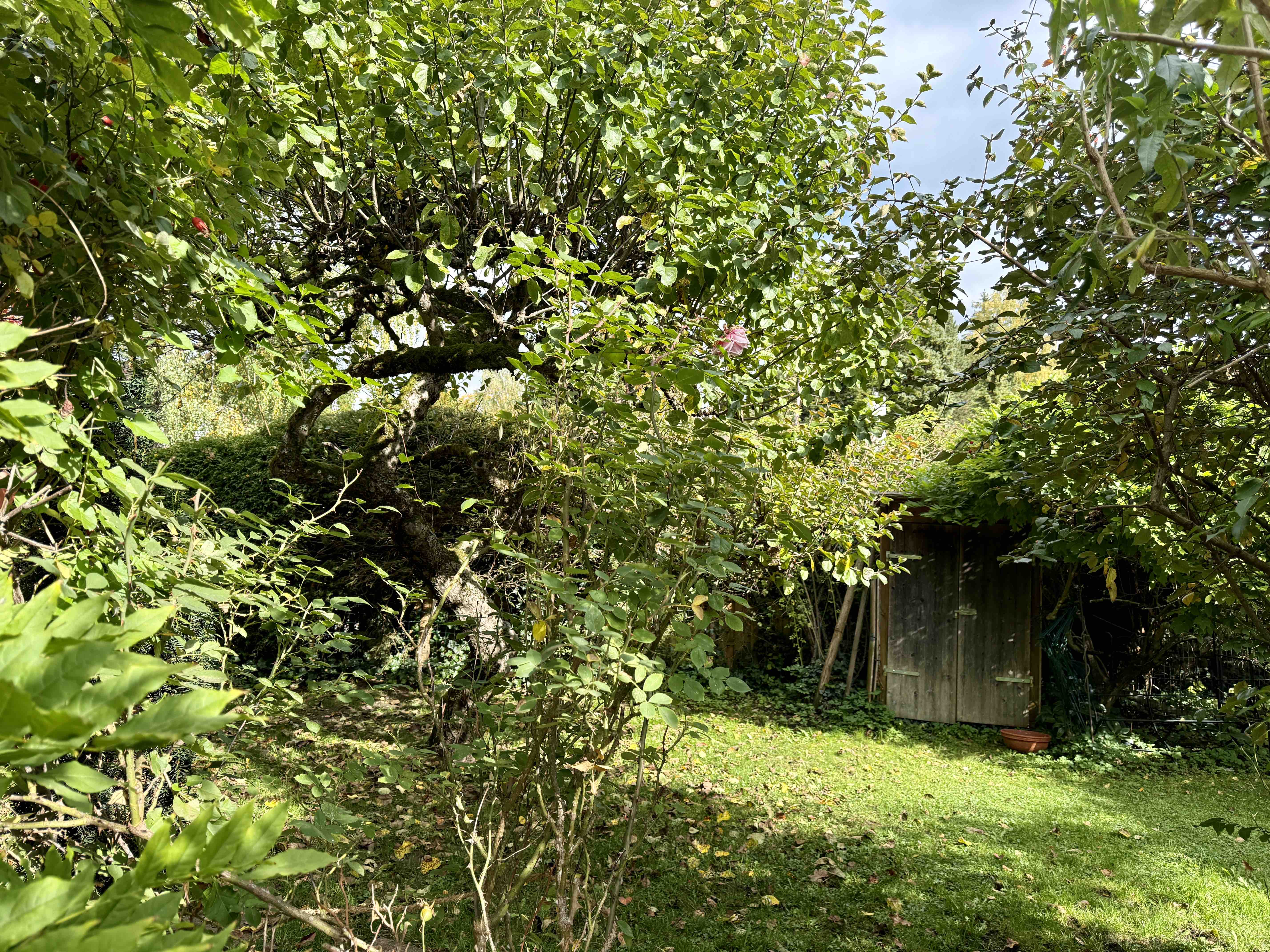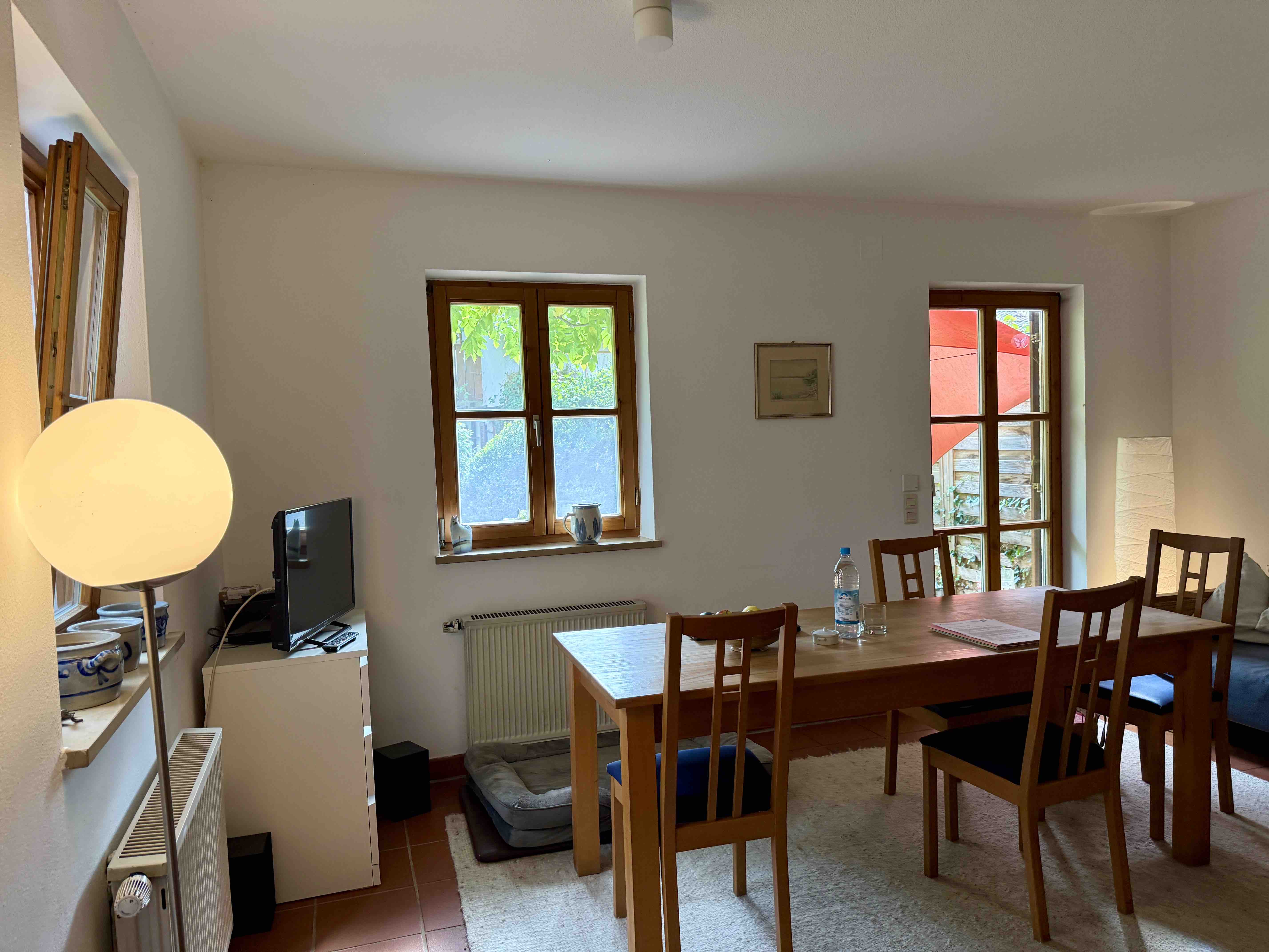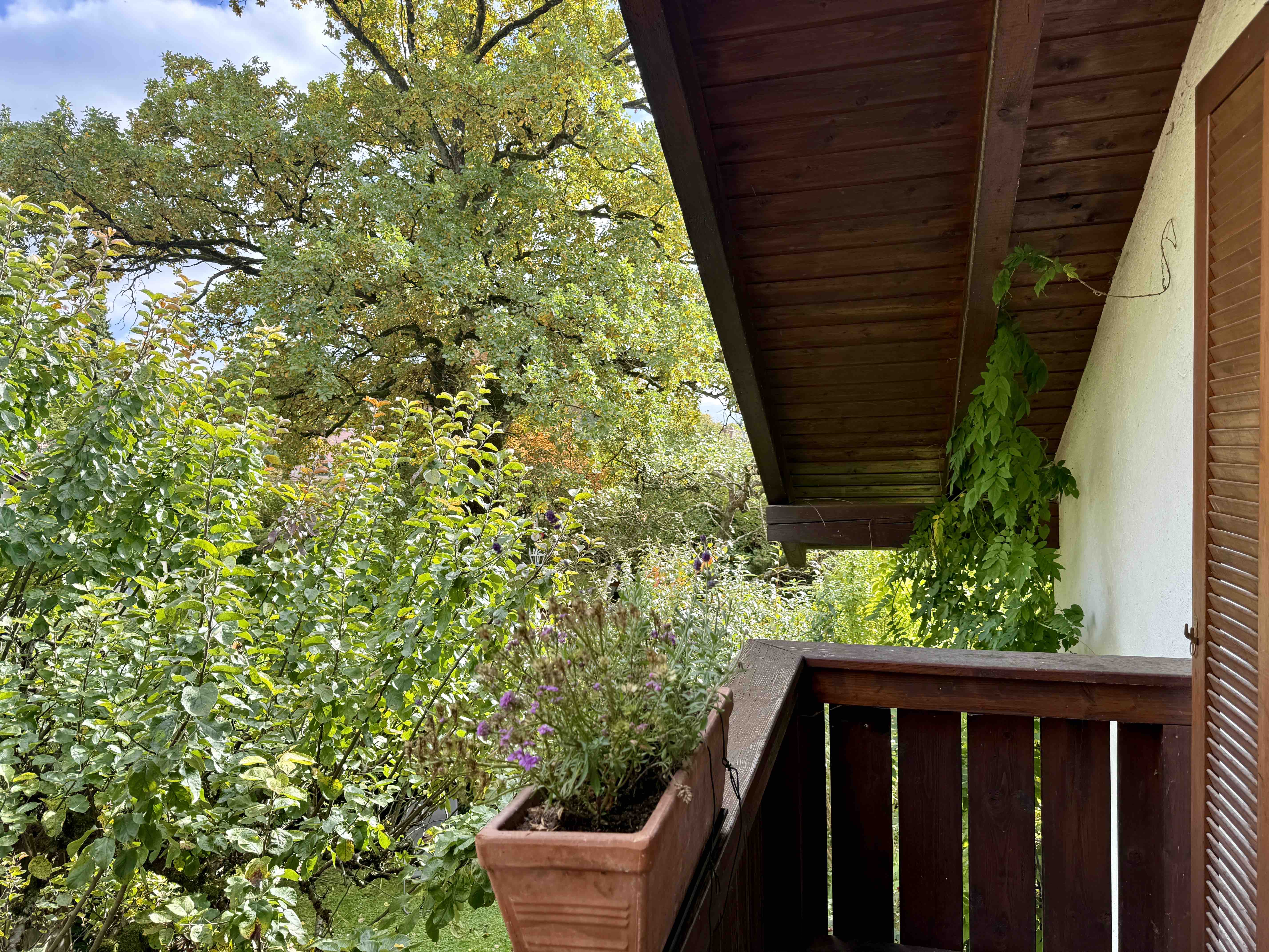 Holz-Sprossenfenster, Holzläden, Cottoboden im Erdgeschoss, Holzdielenboden im Dachgeschoss, Ölheizung (Bj. 2000), Kaminofen, Einzelgarage und Stellplatz