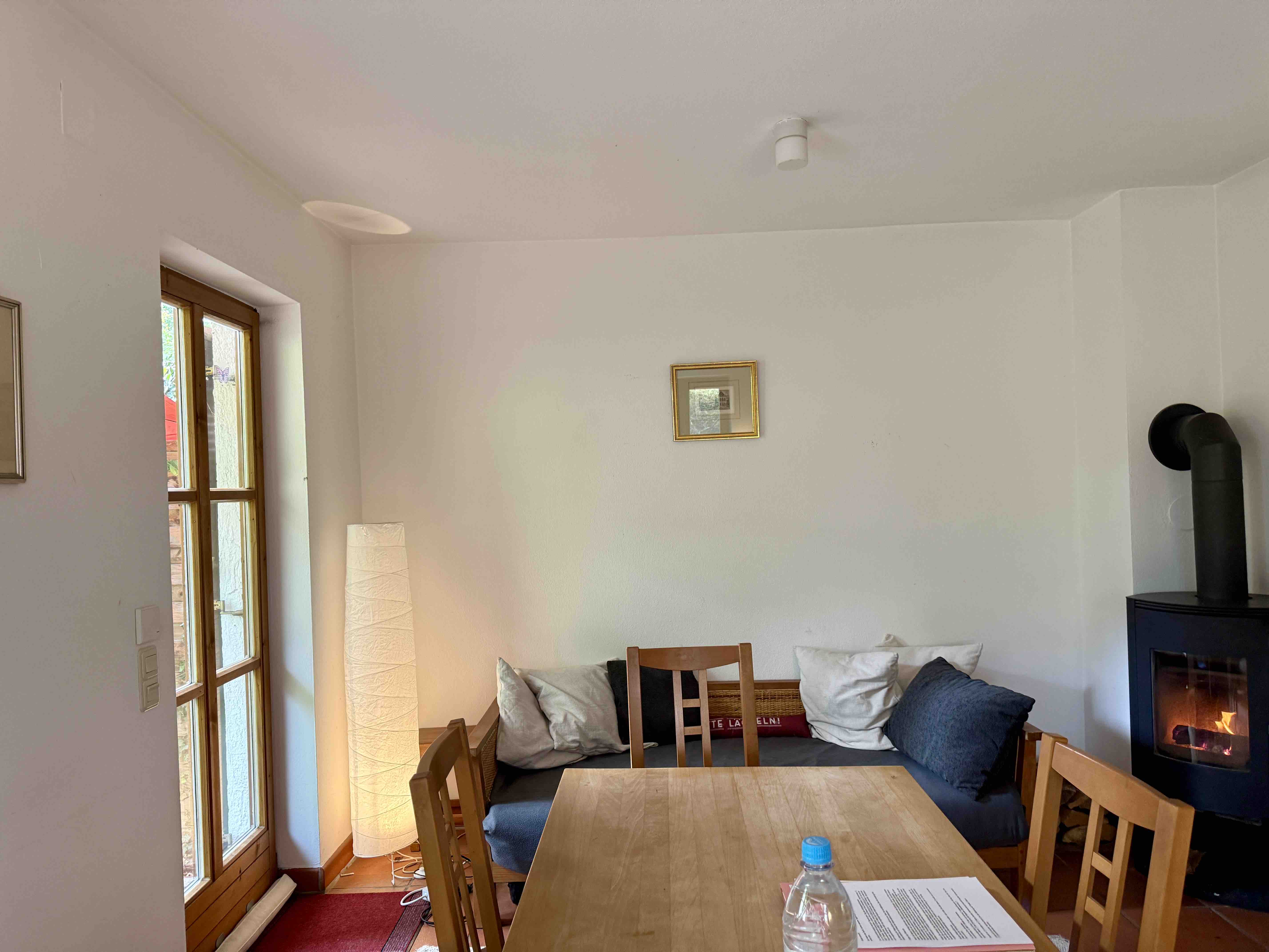Flur, Gäste-WC, offene Küche, Wohn- und Essbereich mit Kaminofen, Terrasse Ost, Terrasse Süd