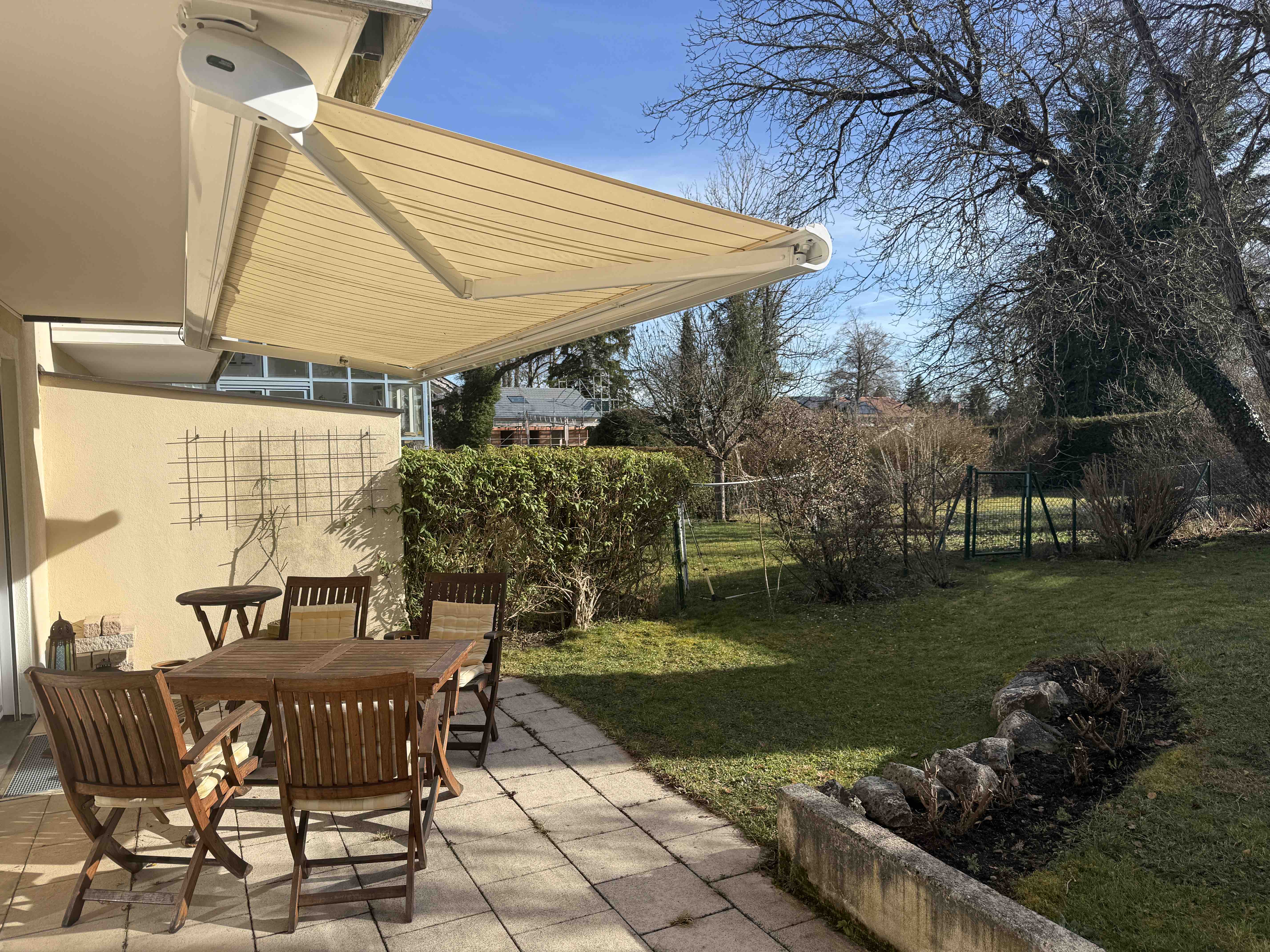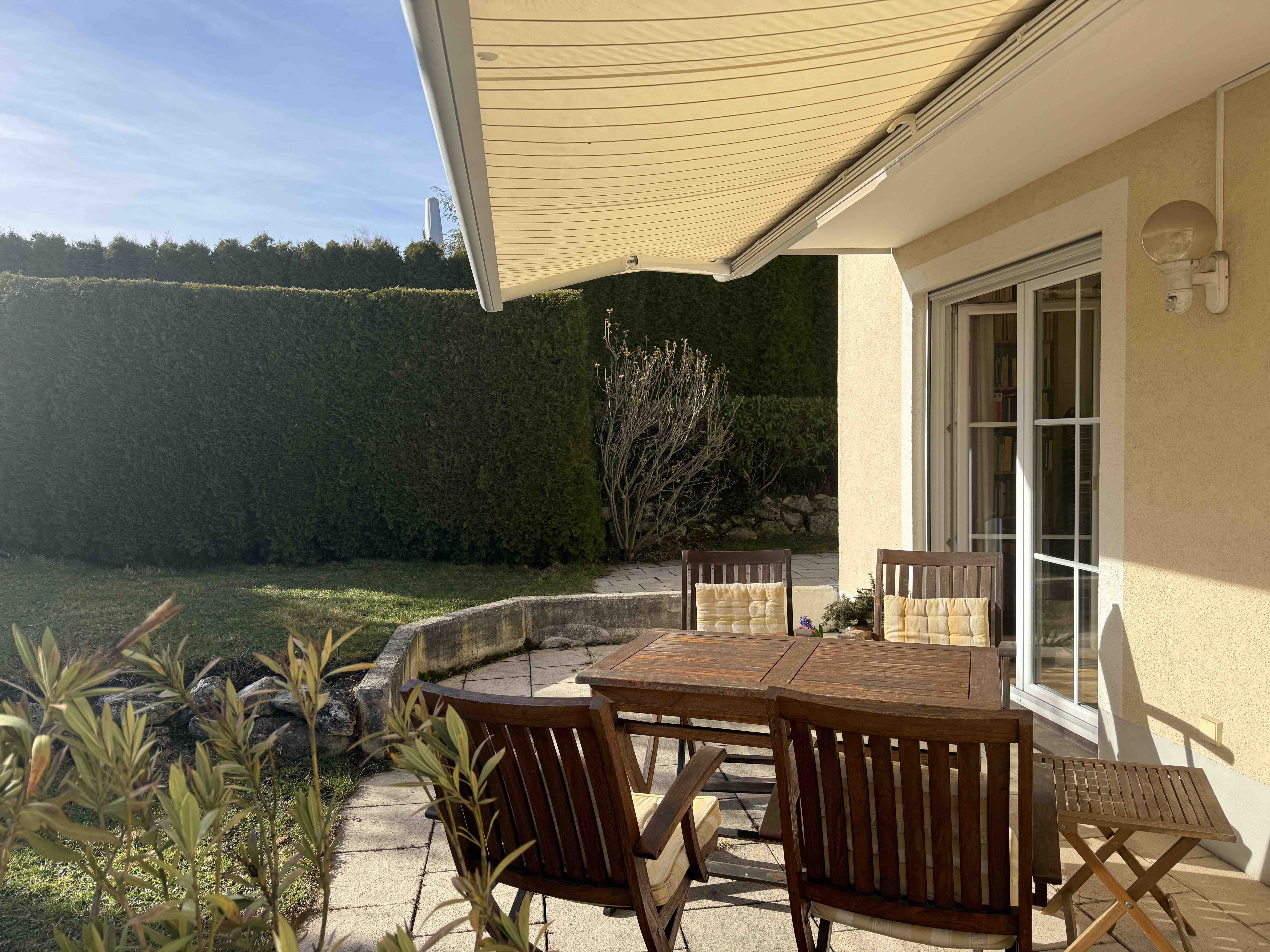 Windfang, Gäste-WC, Flur, Wohnküche, Wohnzimmer, überdachte Südterrasse mit Sonnenmarkise